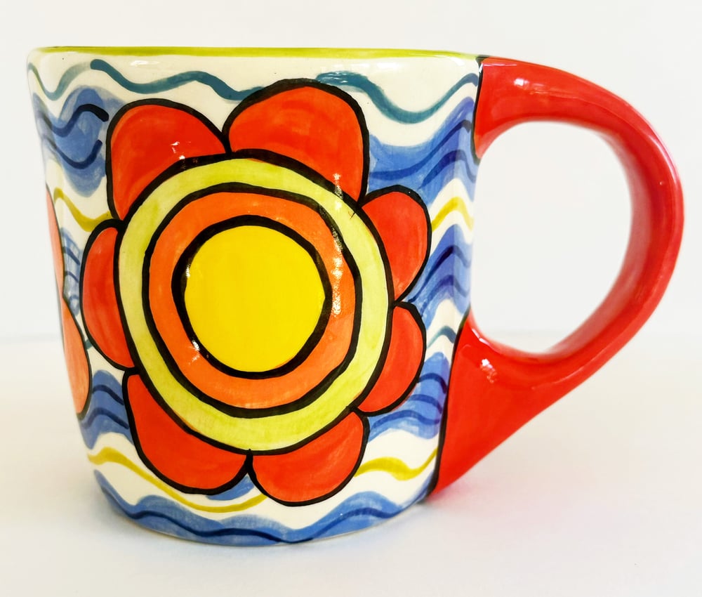 This mug is thrown by me of earthenware clay on my potter's wheel in my studio in western Massachusetts. The handle is pulled and added once the mug is partly dry. Once dry, the food safe lead free colors are applied with a brush and then the thin black detail lines are painted on with a fine brush. I also add some sgraffito to add texture and white highlights.