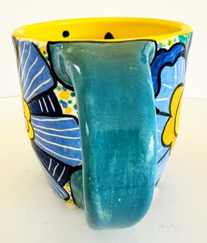 This mug is thrown by me of earthenware clay on my potter's wheel in my studio in western Massachusetts. The handle is pulled and added once the mug is partly dry. Once dry, the food safe lead free colors are applied with a brush and then the thin black detail lines are painted on with a fine brush. I also add some sgraffito to add texture and white highlights.