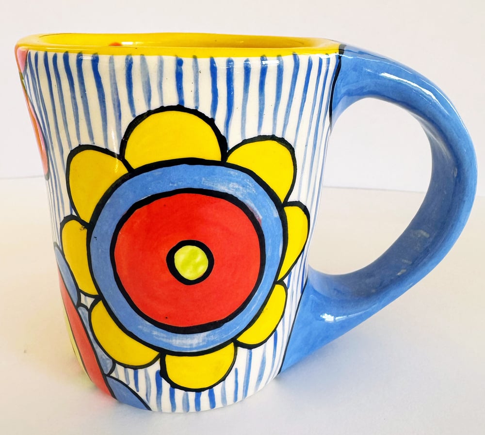 This mug is thrown by me of earthenware clay on my potter's wheel in my studio in western Massachusetts. The handle is pulled and added once the mug is partly dry. Once dry, the food safe lead free colors are applied with a brush and then the thin black detail lines are painted on with a fine brush. I also add some sgraffito to add texture and white highlights.