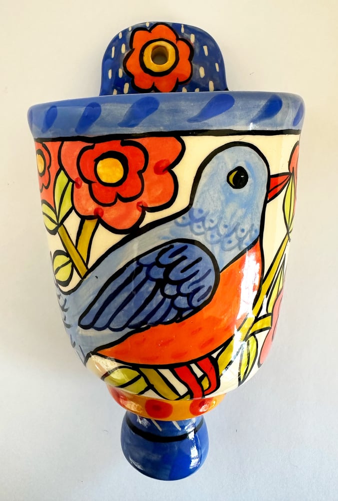 This vase is thrown by me of earthenware clay on my potter's wheel in my studio in western Massachusetts. Every piece I make is totally different. Each piece is fired twice in a ceramic kiln and finished with a shiny glaze.