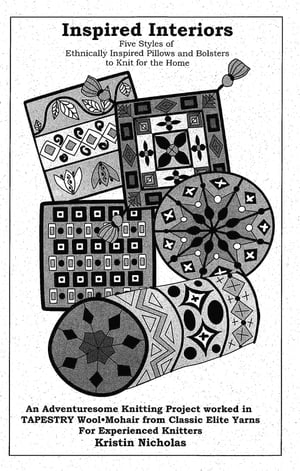 Inspired Interiors Pillows are part of The World Knits Collection designed by Kristin Nicholas. There are 15 different stranded knitting projects which are designed to stretch a knitter’s skills. Each pattern includes instructions and many charts for the knitter to design their own project mixing Fair Isle charts with different stitches. The original kits included 6 colors of yarn, the pattern booklet and a color postcard of the project. Inspired Interiors was originally published in 1995.