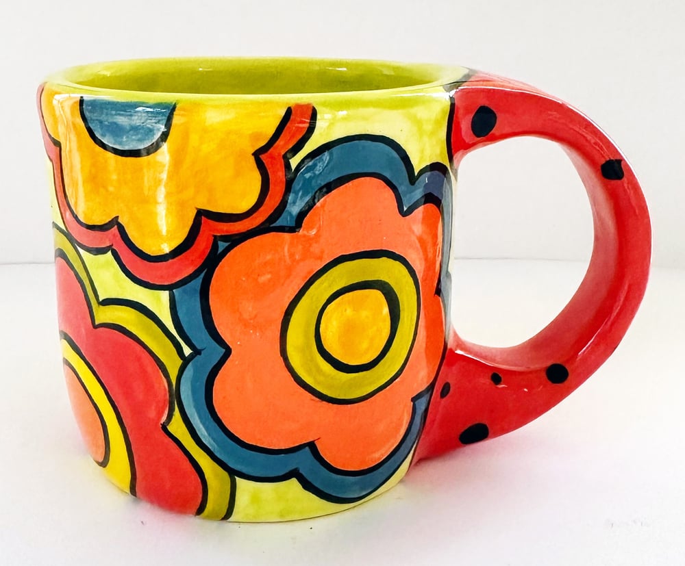 This mug is thrown by me of earthenware clay on my potter's wheel in my studio in western Massachusetts. The handle is pulled and added once the mug is partly dry. Once dry, the food safe lead free colors are applied with a brush and then the thin black detail lines are painted on with a fine brush. I also add some sgraffito to add texture and white highlights.