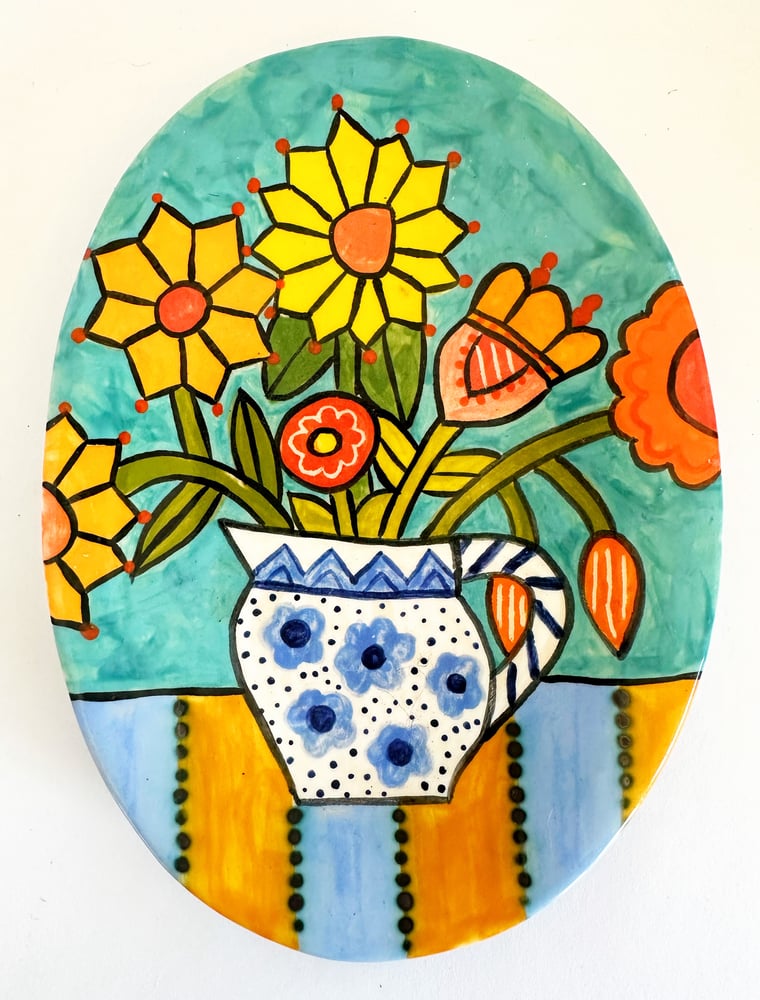 I make each platter out of white earthenware clay. Each platter is inspired by the antique pottery I collect and flowers I grow in my garden here in western Massachusetts each summer. I use underglazes for the color. Each color must be applied 3 times in order to obtain the saturated shades I love. Each piece is fired twice in a ceramic kiln and finished with a shiny glaze.